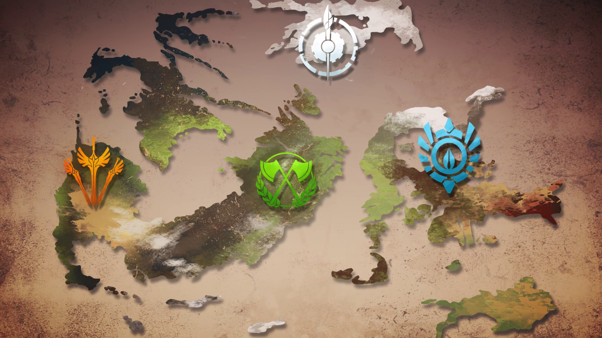 | Mapa de Remmant. El símbolo blanco es Atlas, el naranja es Vacuo, el verde es Vale y el azul es Mistral |